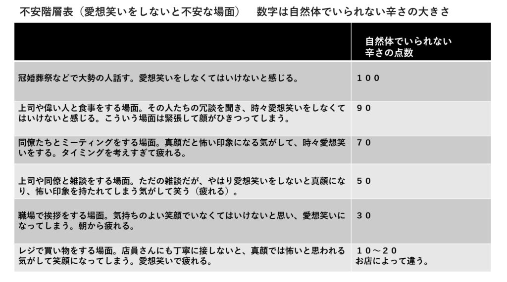 まずは不安階層表にある「上司や同僚と雑談をする場面。」を行動実験する場面に選びます。