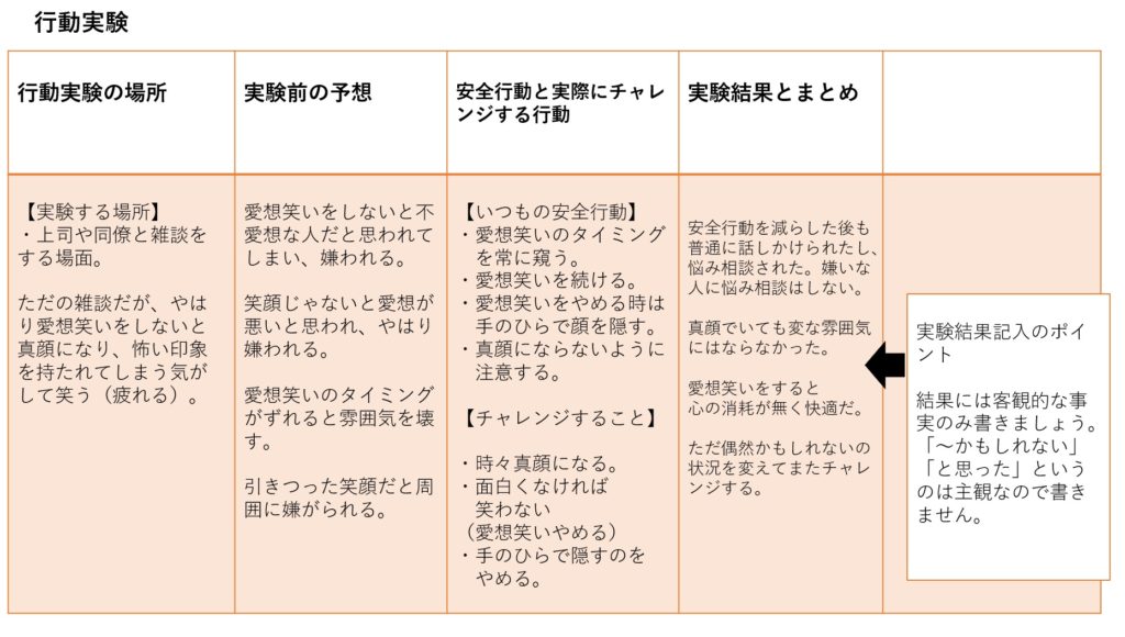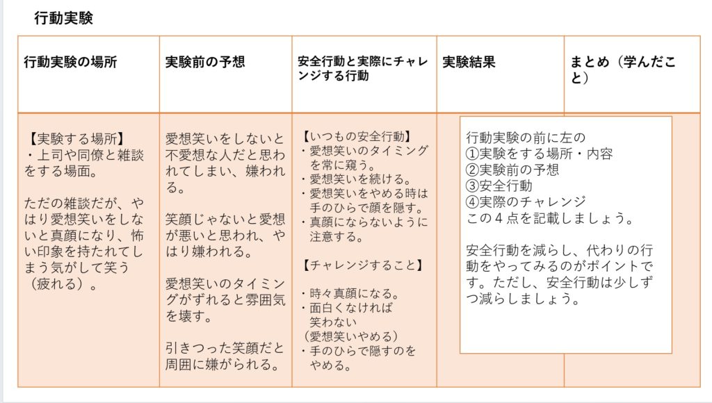 例えば、「繰り返し愛想笑いをする」が安全行動であれば、逆の行動は「愛想笑いの回数を減らす」「1回の雑談で何回までと決めてみる」といったものになります。